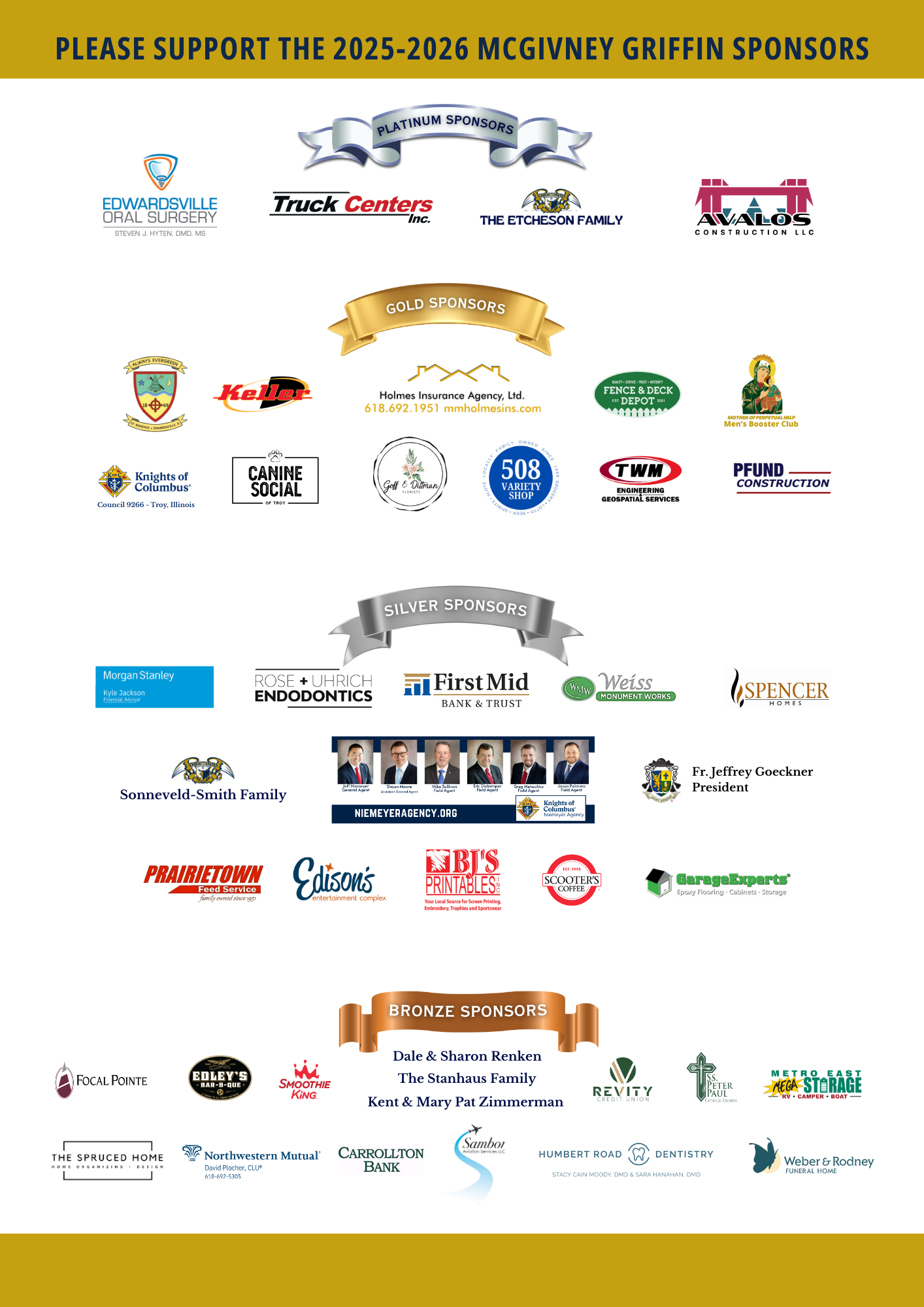 Thank you to all of the businesses and families supporting the 2025-2026 Sponsorship Program. Please support the 2025-2026 McGivney Sponsors that support the Griffins all year long.